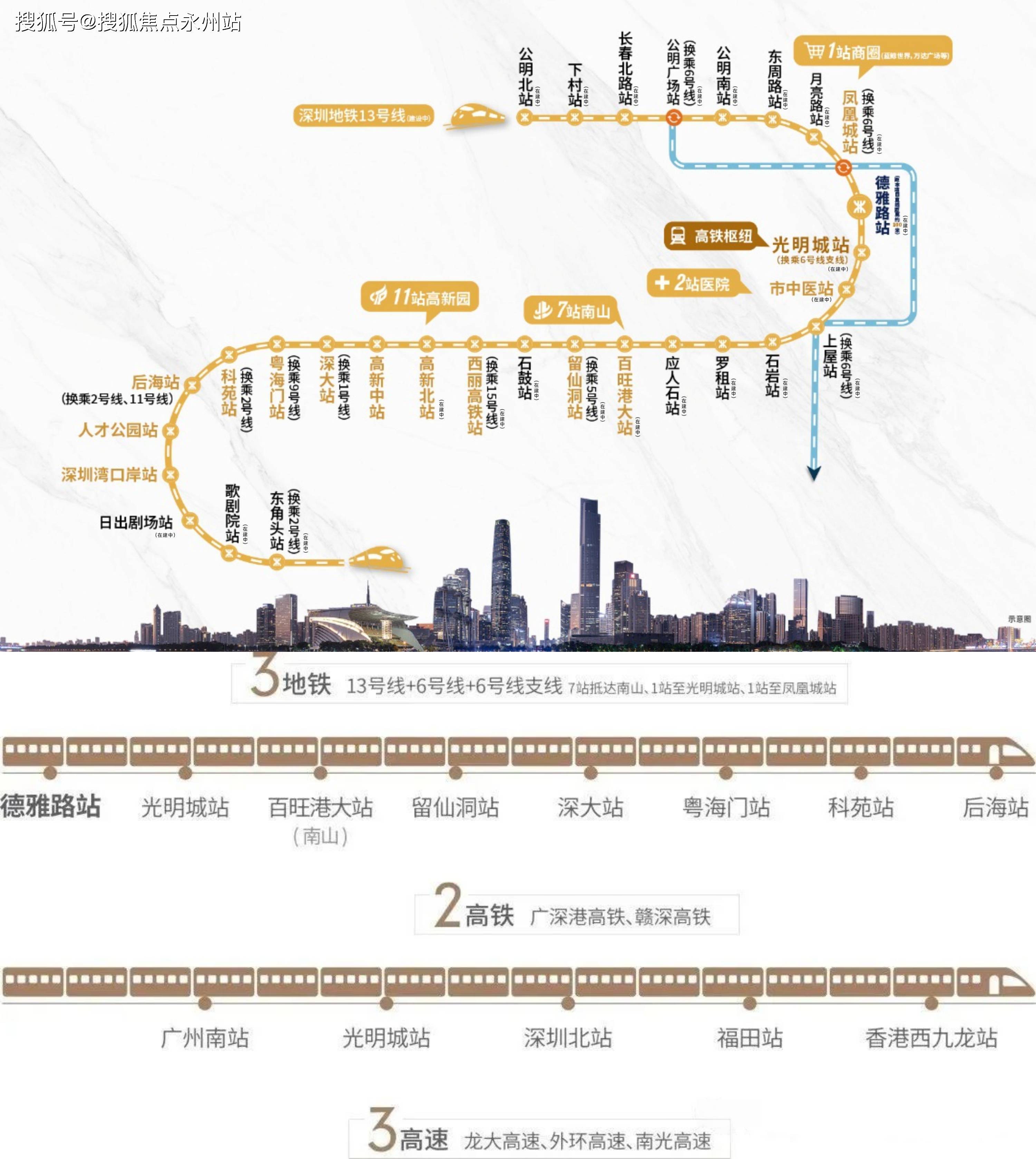 ,未来将推动光明城站TOD 综合开发,构建“轨道+物业+产业”的发展模式,区域价值持续攀升。项目距离地铁13号线德雅路站(原同观路站)仅约100米,该线站可抵南山高新园,8站到留仙洞总部基地,11站至深圳湾口岸,实现南山、福田核心区30分钟通勤圈,临近地铁 6号线光明城站,可快速换乘至福田、罗湖等区域。