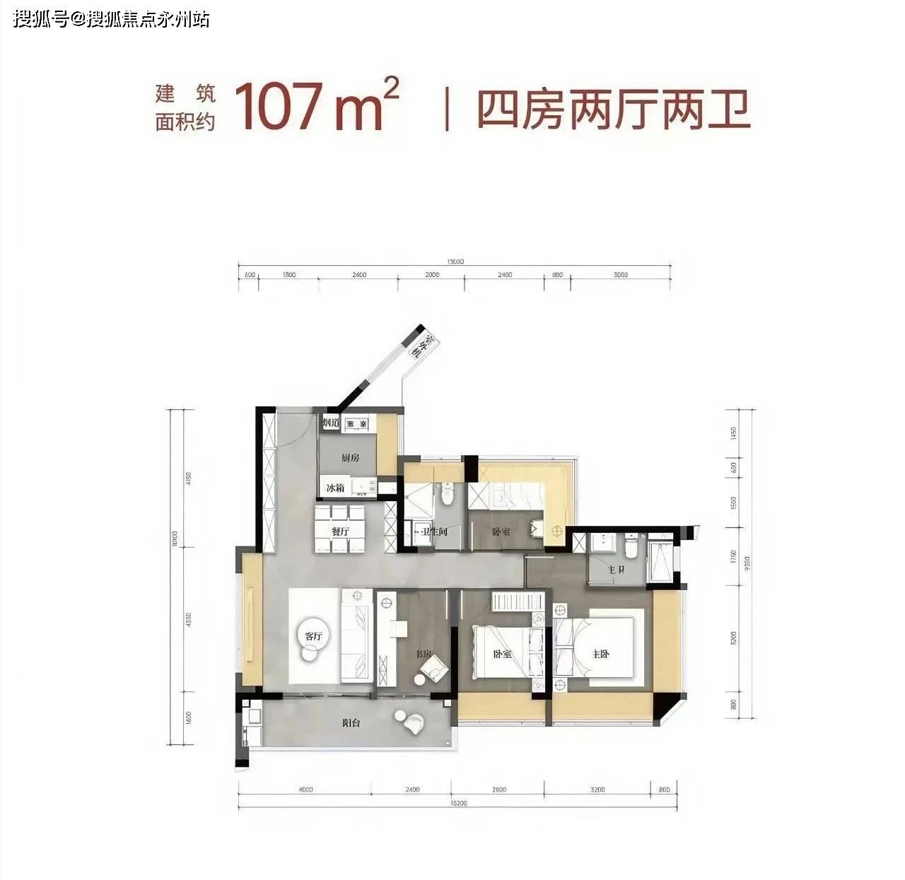 动静分区明确,LDKB(客厅、餐厅、厨房、阳台)一体化设计,客厅开间3.3米,连接4.9㎡景观阳台,主卧配备双飘窗及独立卫浴,次卧与书房可灵活调整功能。